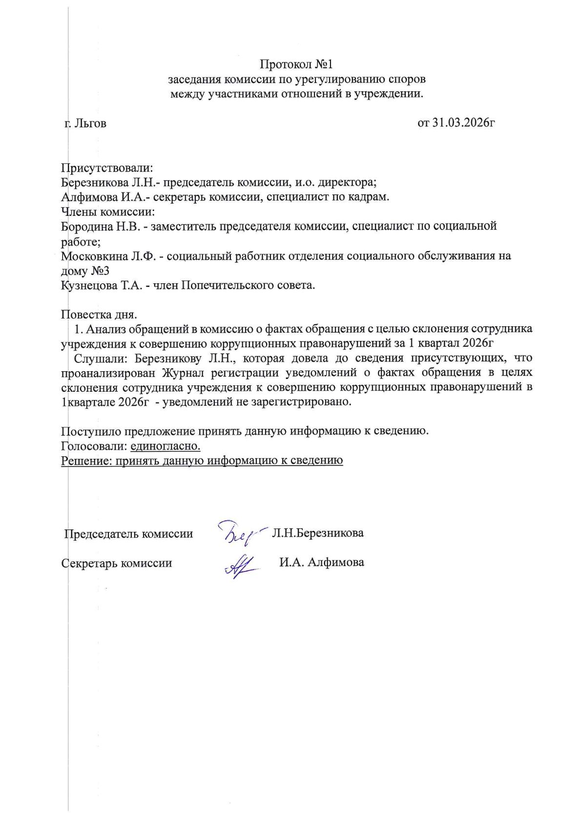 Протокол №1 заседания комиссии по урегулированию споров между участниками отношений в учреждении от 31.03.2026 г.