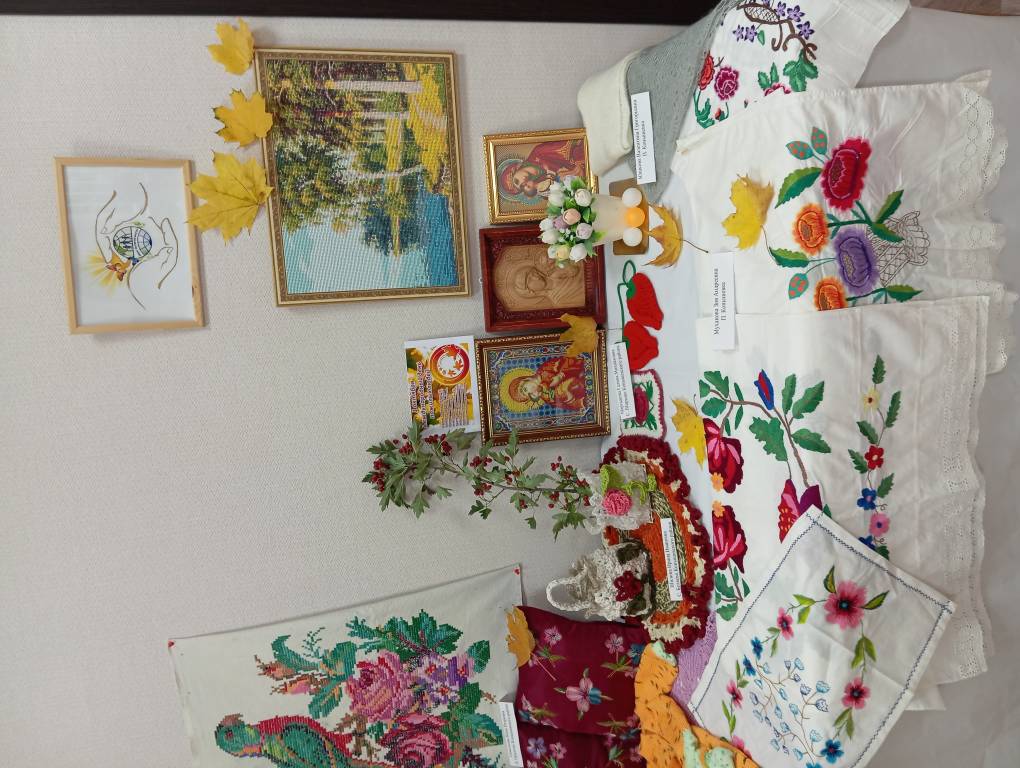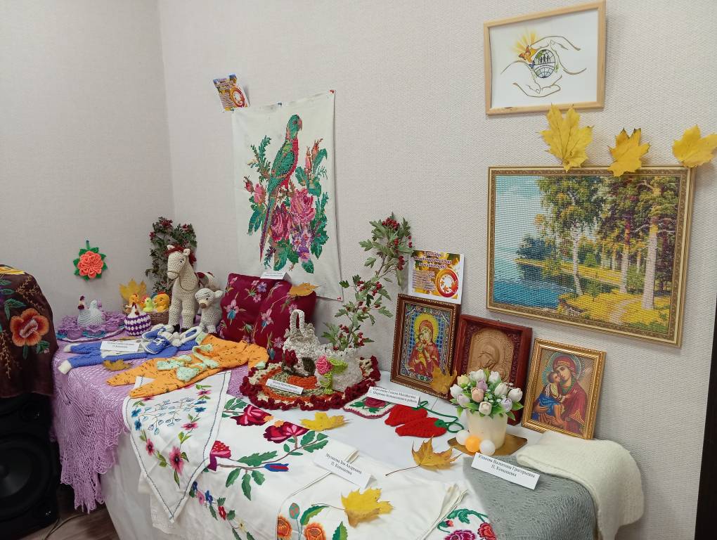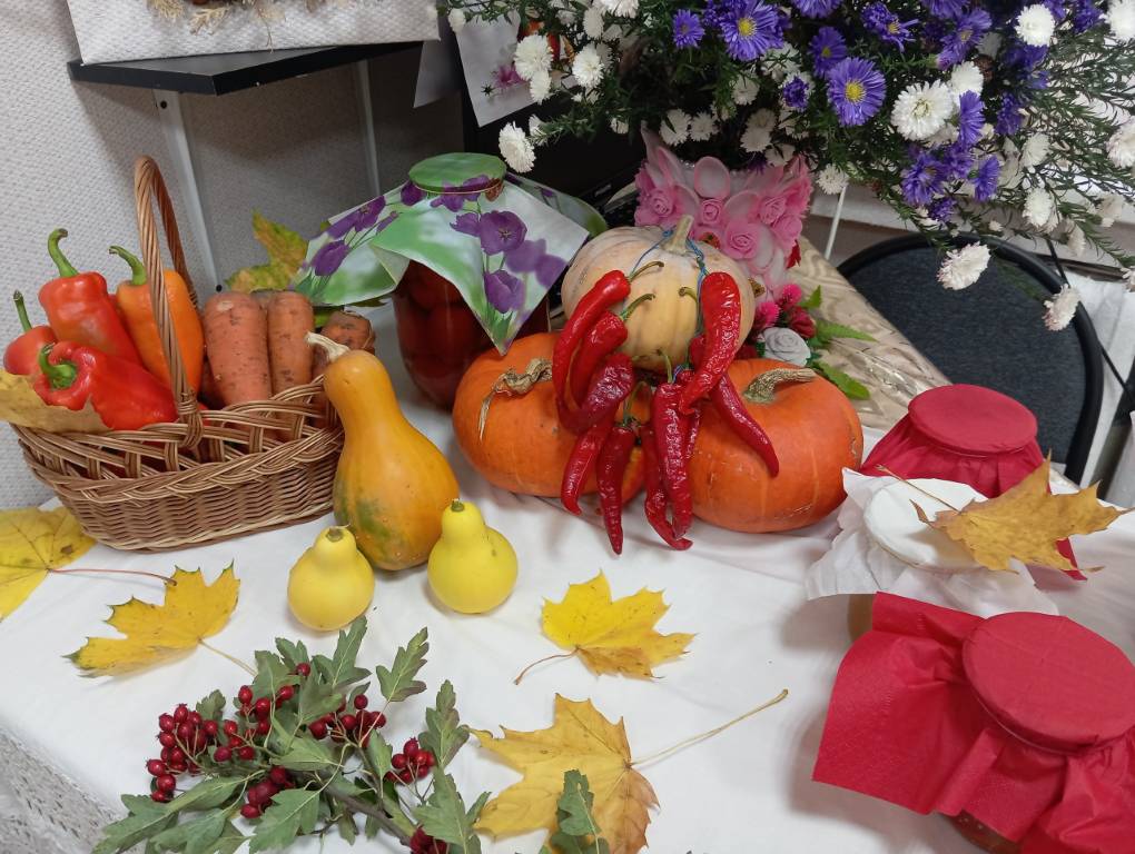 Это выставка «Дары осени», где было представлено разнообразие овощей, фруктов, цветов и заготовок на зиму, которые были лично выращены, законсервированы нашими обслуживаемыми. А также выставка изделий ручной работы: вязаная скатерть, игрушки, платки, прихватки, картины и многое другое. Каждая из работ поражает разнообразием технологий, узоров и различных мотивов.