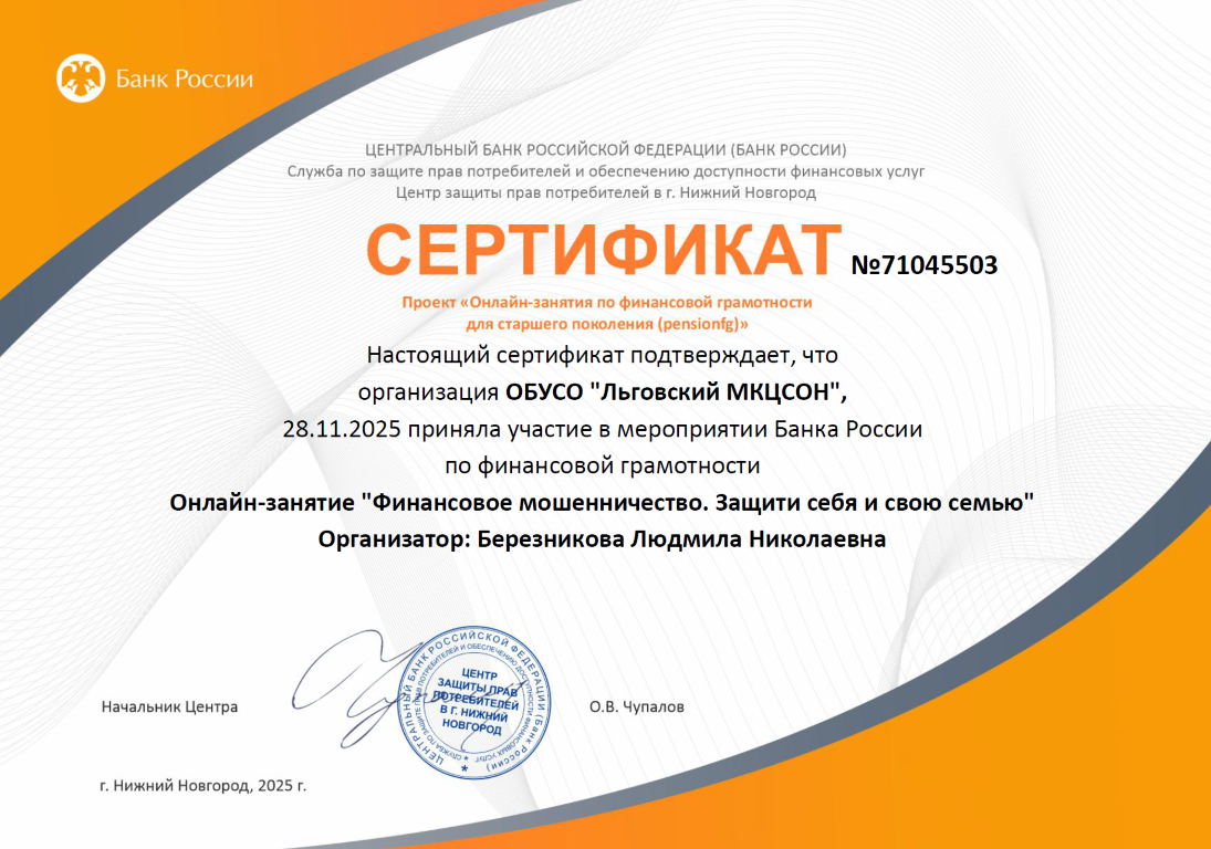 В ОБУСО «Льговский МКЦСОН» продолжаются онлайн - занятия по финансовой грамотности для старшего поколения. В этот раз рассматривали тему: «Финансовое мошенничество. Защити себя и свою семью».