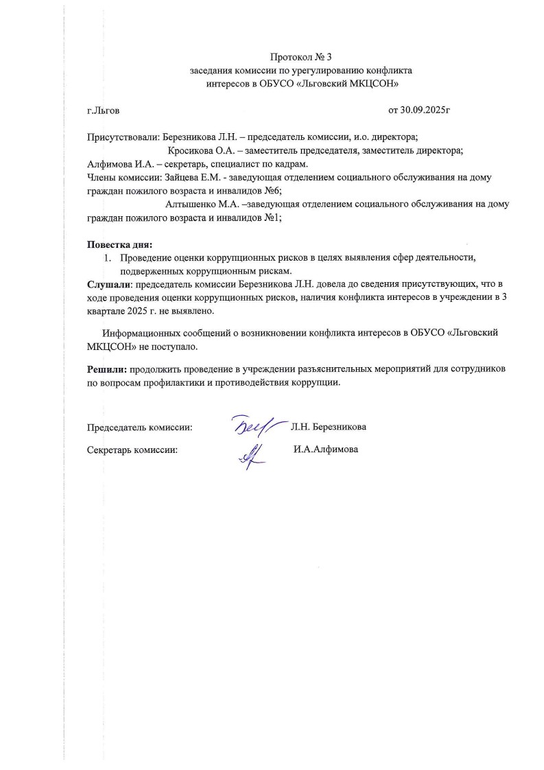 Протокол №3 заседания комиссии по урегулированию конфликта интересов в ОБУСО «Льговский МКЦСОН» от 30.09.2025 г.