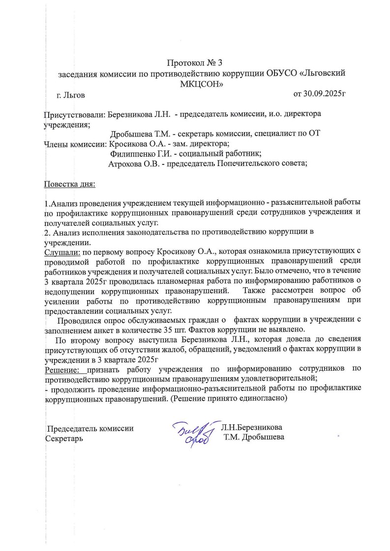Протокол №3 заседания комиссии по противодействию коррупции ОБУСО «Льговский МКЦСОН» от 30.09.2025 г.