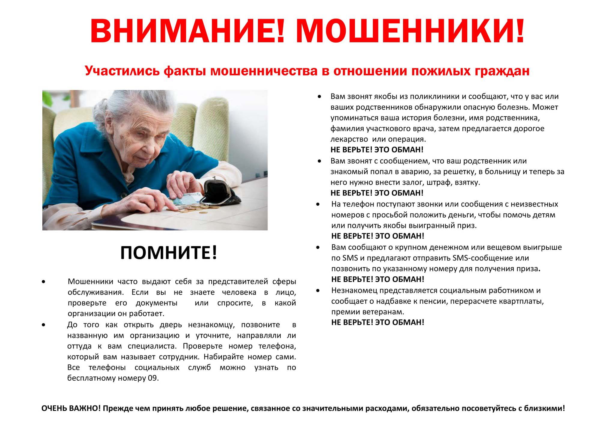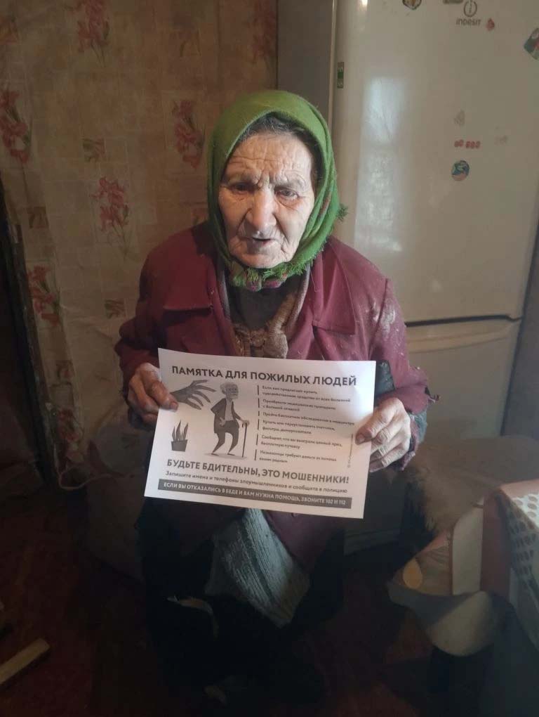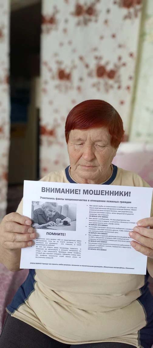 Пожилые люди привыкли безоговорочно доверять каждому, кто произнесёт «соцслужба», «полиция», «собес» или волшебное слово «бесплатно». У пенсионеров, особенно одиноких, из-за изолированного образа жизни обострена потребность в общении, они охотно идут на контакт. Поэтому социальные работники ОБУСО «Льговский МКЦСОН» на постоянной основе проводят беседы и раздают памятки своим обслуживаемым.